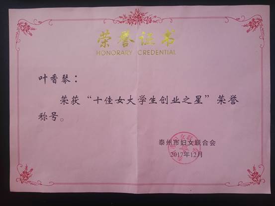近日,由泰州市妇女联合会发起,泰州市人力资源和社会保障局及各大高校联合主办的“十佳女老员工创业之星”评选活动落下帷幕。公司15级应用化学专业叶香琴同学榜上有名。