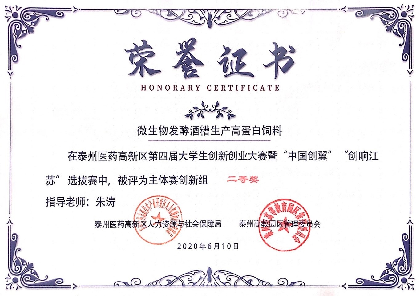 本次比赛共有在泰高校、区各街镇等100多个创业团队参加,项目涵盖文化传媒、生物科技、餐饮、能源科技、农牧科技等诸多领域。经过项目初审、路演复赛,共筛选出10个创新组项目进入决赛。公司《微生物发酵酒糟生产高蛋白饲料》项目经过前期调研,科学论证,精心打磨,最后稳定发挥,获得了评委专家的充分肯定,取得创新组第二