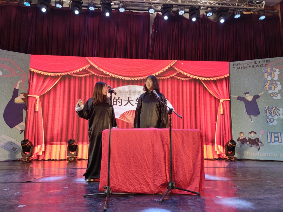接着是精彩纷呈的各类表演:相声《我的老员工活》以诙谐幽默的语言讲述了大学四年的姐妹情;《北京东路的日子》、《光年之外》、《大鱼》唱出了毕业生心里那份不舍与留念;图文并茂的诗朗诵《我们一起走过的青春》让在场毕业生又一次回忆起四年的泰院时光。