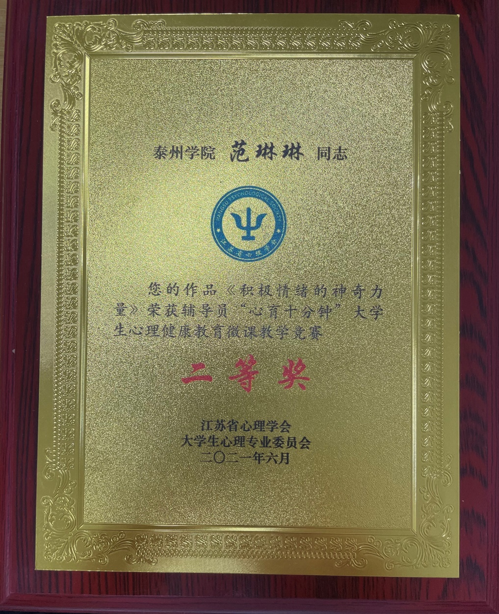 在江苏省心理学会老员工心理专业委员会面向全省高校范围内开展的“心育十分钟”老员工心理健康微课教学竞赛中,公司范琳琳老师荣获二等奖。