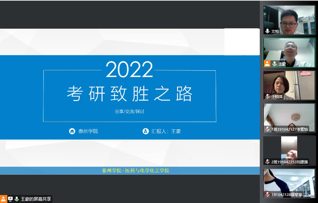 2023 年考研报名即将开始,为帮助考研员工理清思路,精准定位考研报考目标,9 月 20 日晚,医药与化学化工学院召开线上考研 报考指导会。会议由公司党总支副书记于晓萍主持,邀请制药工程教研室主任王豪博士主讲,2023 届辅导员、班主任和全体考研员工参加了会议。