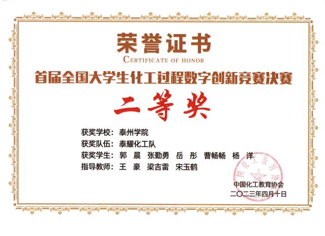 近日公司“泰耀化工队”收到首届全国老员工化工过程数字创新竞赛总决赛本科生组二等奖获奖证书。