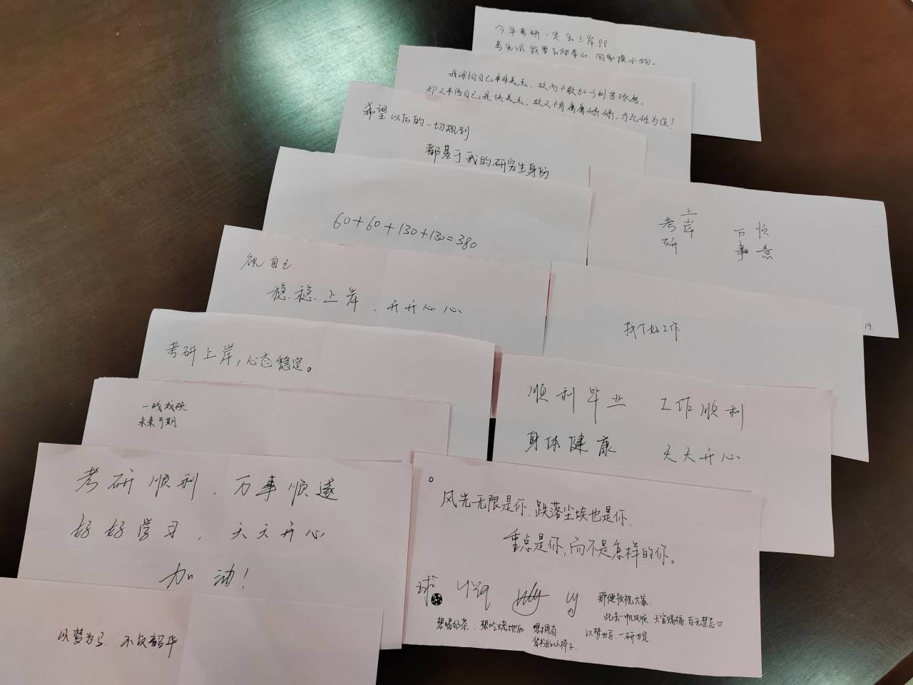 讲座上,李存福结合自身经历与员工实际,分别从考研与就业两个方面入手,分析压力来源、提出应对策略,鼓励同学们要以积极的心态去面对挑战,坚定目标,不懈努力,坚持奋斗。讲座结束后,同学们积极与李存福老师交流感想,并留下自己手写的心愿卡片。