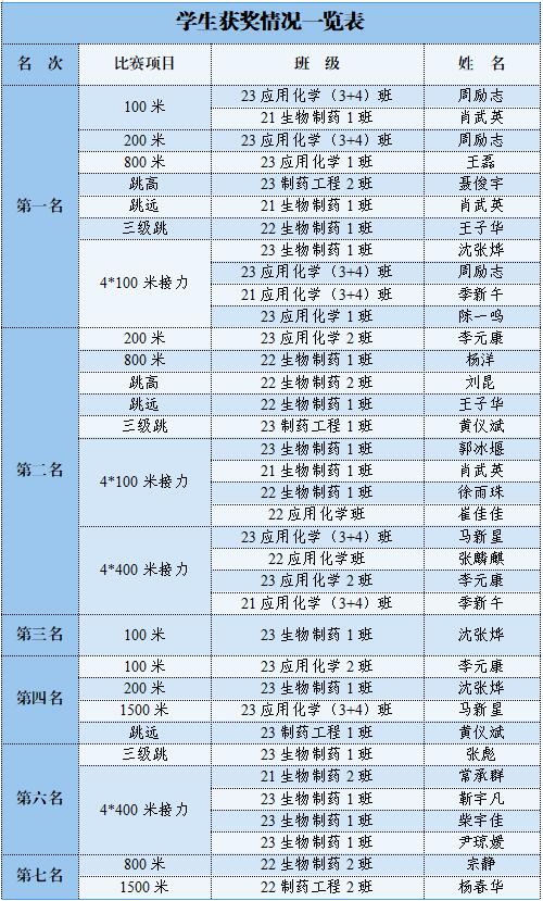 赛场上,药化学子奋力拼搏,全力冲刺。在个人单项赛中,获得一等奖7项、二等奖5项,三等奖1项,其中男子跳高项目打破校记录。在团队项目比赛中,运动员齐心协力,配合默契,取得男子4×100米接力第一、女子4×100米接力和男子4×400米接力第二,充分展现了药化学子顽强拼搏的团队精神。公司参赛运动员、志愿者以及老师们秉承“更高、更快、更强、更团结”的体育精神,相互配合、共同努力,为荣誉而战,充分彰显了公司师生团结奋进、超越自我的精神面貌。