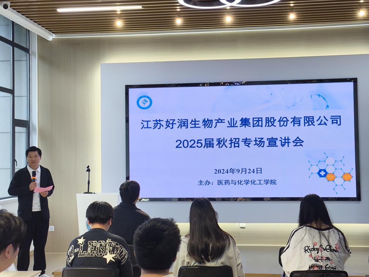 为促进2025届毕业生高质量充分就业,抓住秋季校园招聘“黄金期”,9月23日、24日下午,公司邀请江苏扬子江医药经营有限公司、济川药业集团有限公司、江苏好润生物产业集团股份有限公司等企业来校开展专场招聘活动,公司党总支书记朱诚、党总支副书记张红祥、就业辅导员唐成志以及2025届毕业生参加活动。